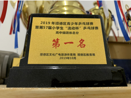 2018年度、2019年度順德區(qū)青少年乒乓球比賽暨56屆小學(xué)生“流動(dòng)杯”乒乓球比賽高中組團(tuán)體總分第一名;