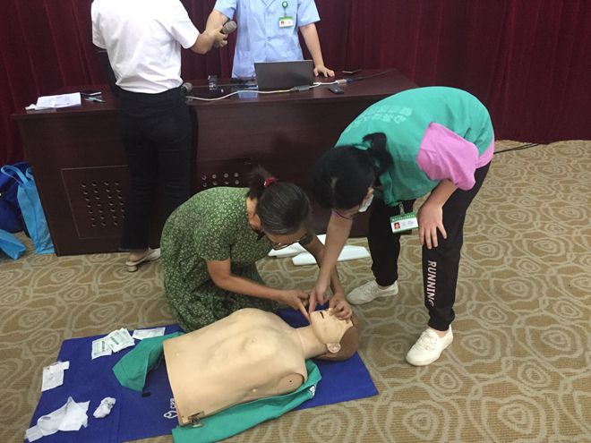 本次知識講座分為理論知識講解和實際操作兩部分,張醫(yī)生采用PPT形式,從心跳呼吸驟停可發(fā)生的場所、個體、心肺復(fù)蘇概念、黃金救命時間等方面做了詳細的介紹,同時結(jié)合不同傷情下應(yīng)采取的不同急救措施,對心肺復(fù)蘇各環(huán)節(jié)技術(shù)和流程進行了現(xiàn)場示范。