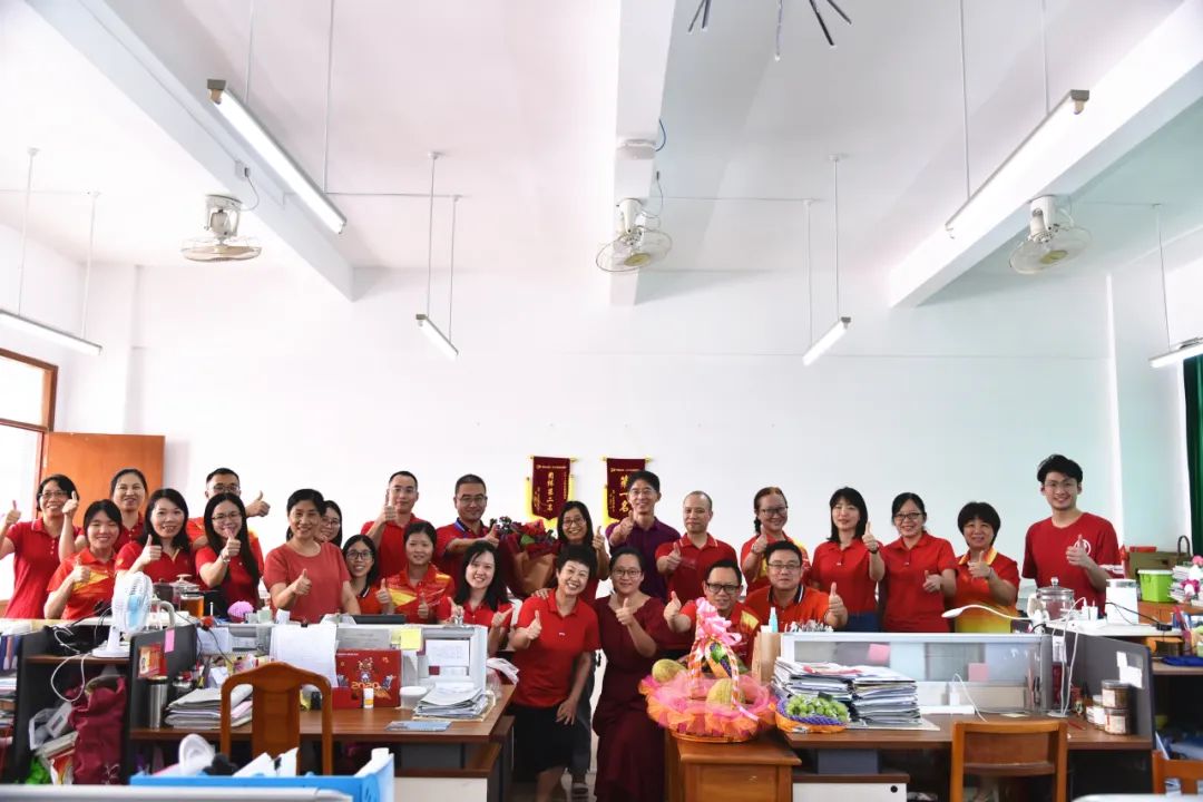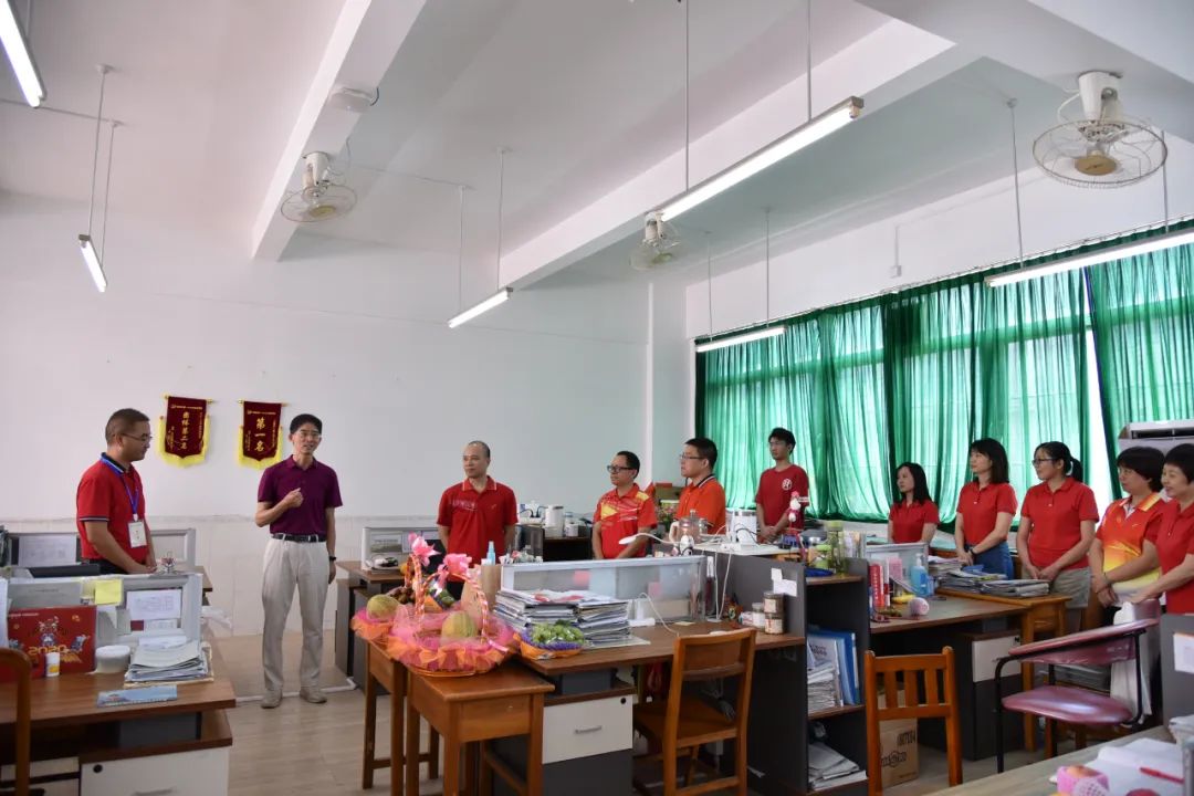 區(qū)領(lǐng)導(dǎo)與我校行政在成功門前留影,預(yù)祝中考勝利!在白建元副校長及陳水繹副校長等的陪同下,張毅副局長一行來到初三教師辦公室為初三老師送上寓意“碩果累累”的夏日水果及寓意“大紅大紫、好事連連”的鮮花,并與老師們進行親切交流。