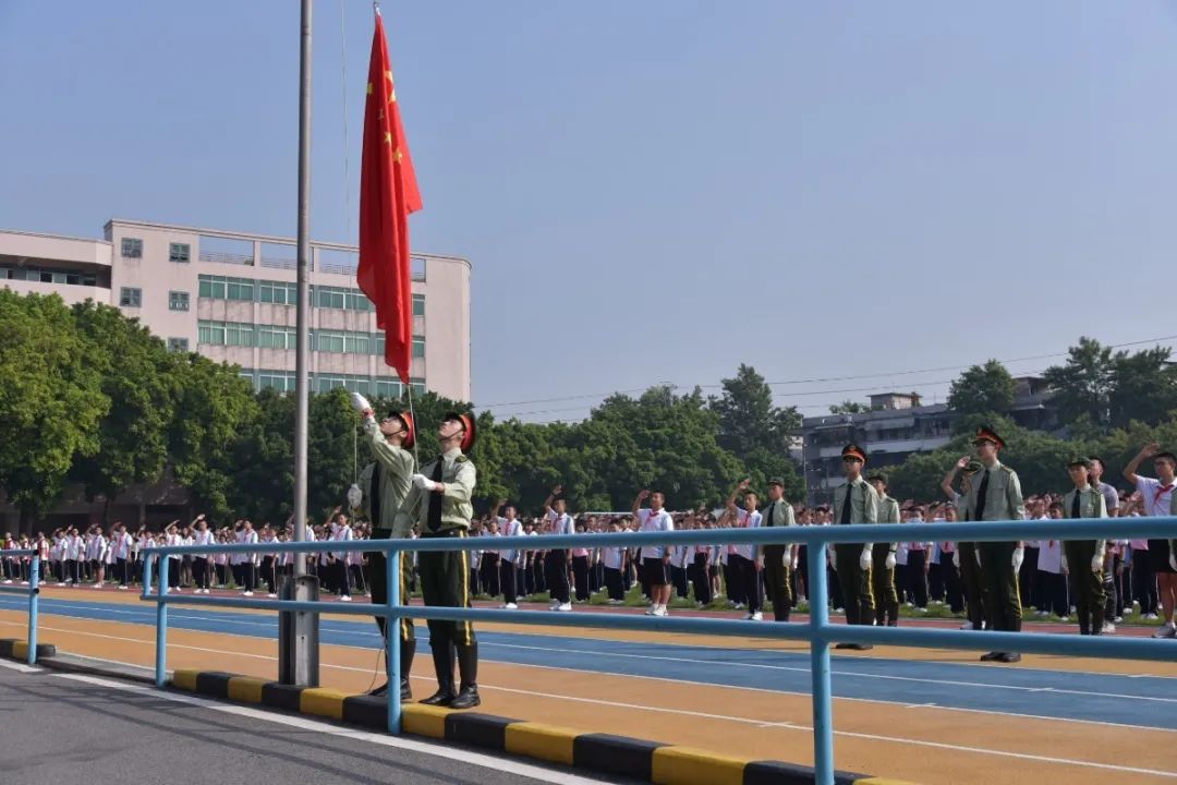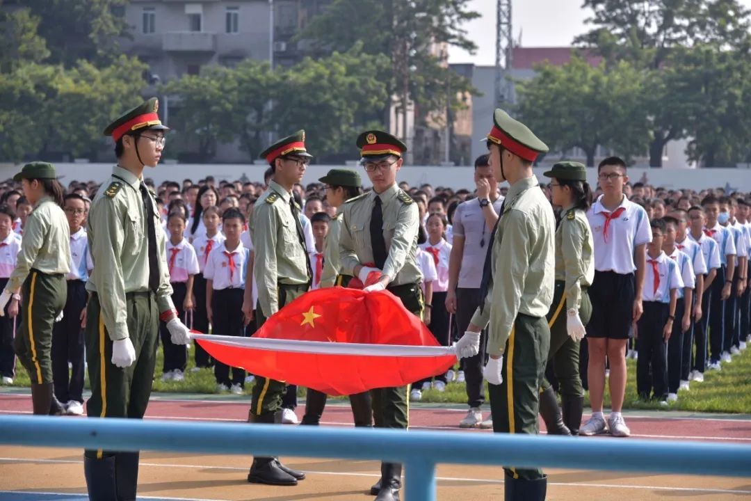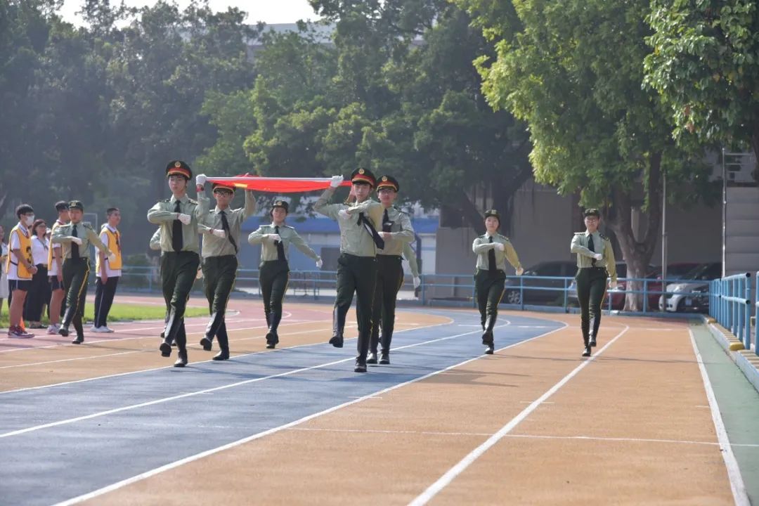 在莊嚴的國歌聲下,開學典禮拉開帷幕。旗手們邁著鏗鏘有力的腳步,精神抖擻進場。