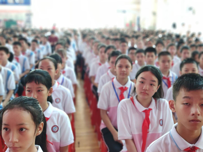 (初二的班長帶領(lǐng)各班“傳經(jīng)送寶”,參觀校園)