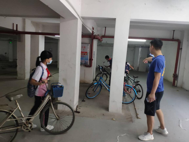 (值日老師指引學(xué)生放好自行車)
