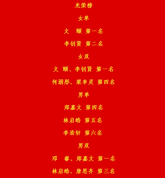 華僑中學(xué)代表順德區(qū)參加高中組別的比賽,本次比賽的運(yùn)動員有:林啟皓、李浩軒、唐思齊、鄭嘉文、鄧睿、文頤、李釗賢、何洇彤、梁幸靈。郭千軍老師、杜亮老師擔(dān)任教練。為了備戰(zhàn)此次比賽,在教練的帶領(lǐng)下,華僑中學(xué)乒乓球隊(duì)隊(duì)員刻苦訓(xùn)練,面對困難與疲勞,他們沒有畏懼和退縮,任汗水打濕脊背,任疲憊爬滿全身依然奮力堅(jiān)持,因?yàn)樗麄冎挥幸粋€(gè)目標(biāo),就是拿下要拿冠軍,為團(tuán)隊(duì)贏得榮譽(yù)。天道酬勤,運(yùn)動員在賽場上不畏強(qiáng)敵,冷靜應(yīng)戰(zhàn),艱苦拼搏,最終獲得高中組團(tuán)體總分第一名的優(yōu)異成績,文頤同學(xué)勇奪女單和女雙冠軍被評為“最佳運(yùn)動員”,為華僑中學(xué)和順德區(qū)爭取了榮譽(yù)。