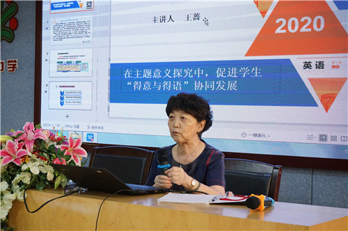 在講座環(huán)節(jié),王薔教授以“在主題意義探究中,促進學生‘得意與得語’協(xié)同發(fā)展”為題,高屋建瓴地提出語言的教育要避免鐘擺效應,走極端,在教學傳承上,切忌“Throw the baby out with the bath water”。教師要以始終關(guān)注培養(yǎng)學生正確的價值觀、必備品格及關(guān)鍵能力的核心素養(yǎng)為己任。王教授強調(diào)英語課程目標的轉(zhuǎn)型,廣大教師要關(guān)注學科的育人價值、 學生的發(fā)展思維和核心素養(yǎng)的落地,在重組課程內(nèi)容的同時要注重以主題為引領(lǐng)、以語篇為依托。為了讓講座更深入淺出,王教授以具體的課堂教案為范例,點對點講解如何在實際教學中探究主題意義,落實各項教育教學目標。