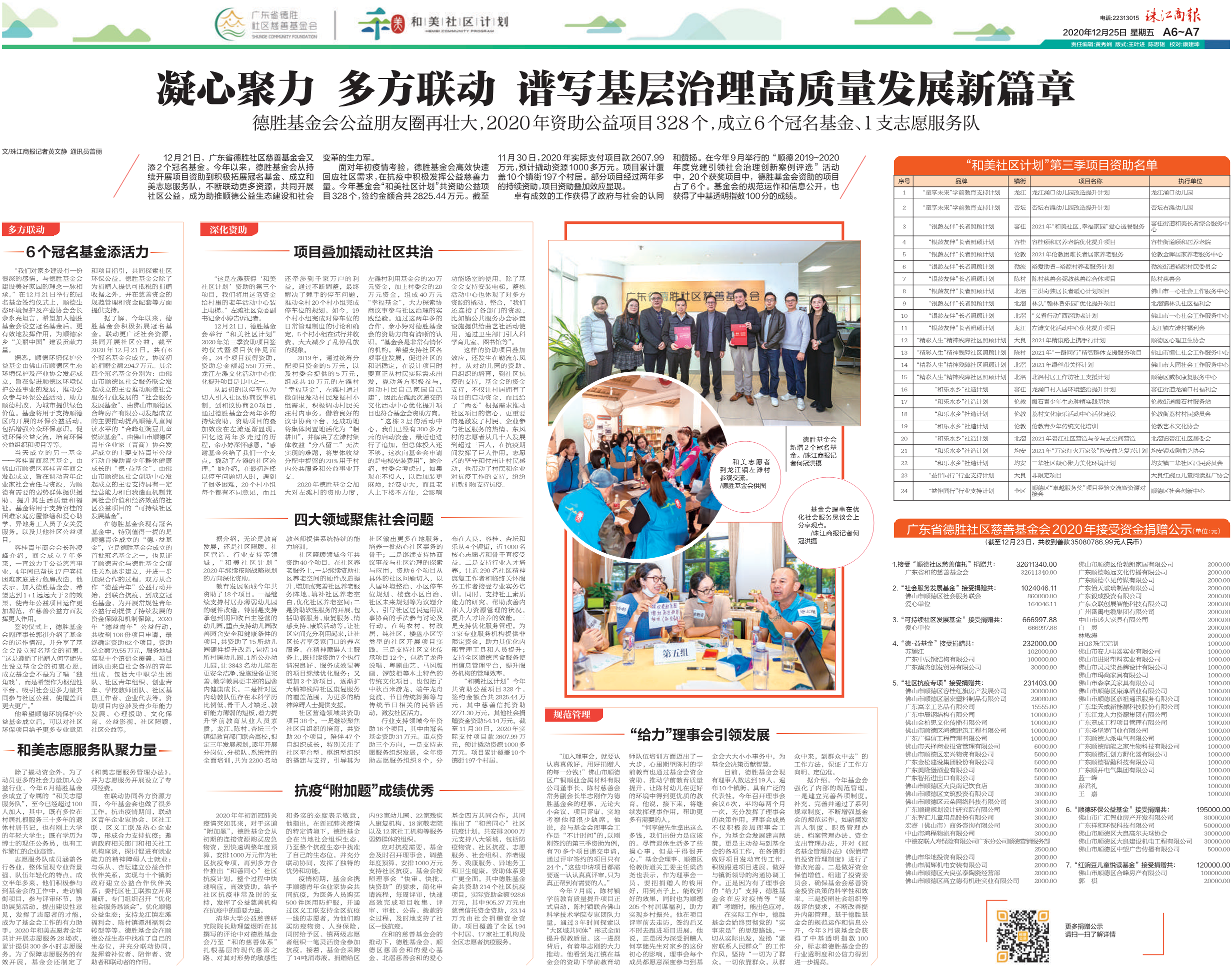 據(jù)了解,今年以來,德勝基金會積極拓展冠名基金,聯(lián)動更廣泛社會資源,共同開展社區(qū)公益,截至2020年12月21日,共有6個(gè)冠名基金會成立,協(xié)議初始捐贈金額294.7萬元。其余四個(gè)冠名基金分別為:由佛山市順德區(qū)社會服務(wù)聯(lián)會發(fā)起成立的主要推動順德社會服務(wù)行業(yè)發(fā)展的“社會服務(wù)發(fā)展基金”、由佛山市順德區(qū)合峰房產(chǎn)有限公司發(fā)起成立的主要推動提高順德兒童閱讀水平的“合峰紅豌豆兒童悅讀基金”、由佛山市順德區(qū)青年企業(yè)家(青商)協(xié)會發(fā)起成立的主要支持青年公益行動并援助青少年群體健康成長的“德·益基金”、由佛山市順德區(qū)社會創(chuàng)新中心發(fā)起成立的主要支持具有一定經(jīng)營能力和自我造血機(jī)制兼具社會價(jià)值和經(jīng)濟(jì)效益的社區(qū)公益項(xiàng)目的“可持續(xù)社區(qū)發(fā)展基金”。