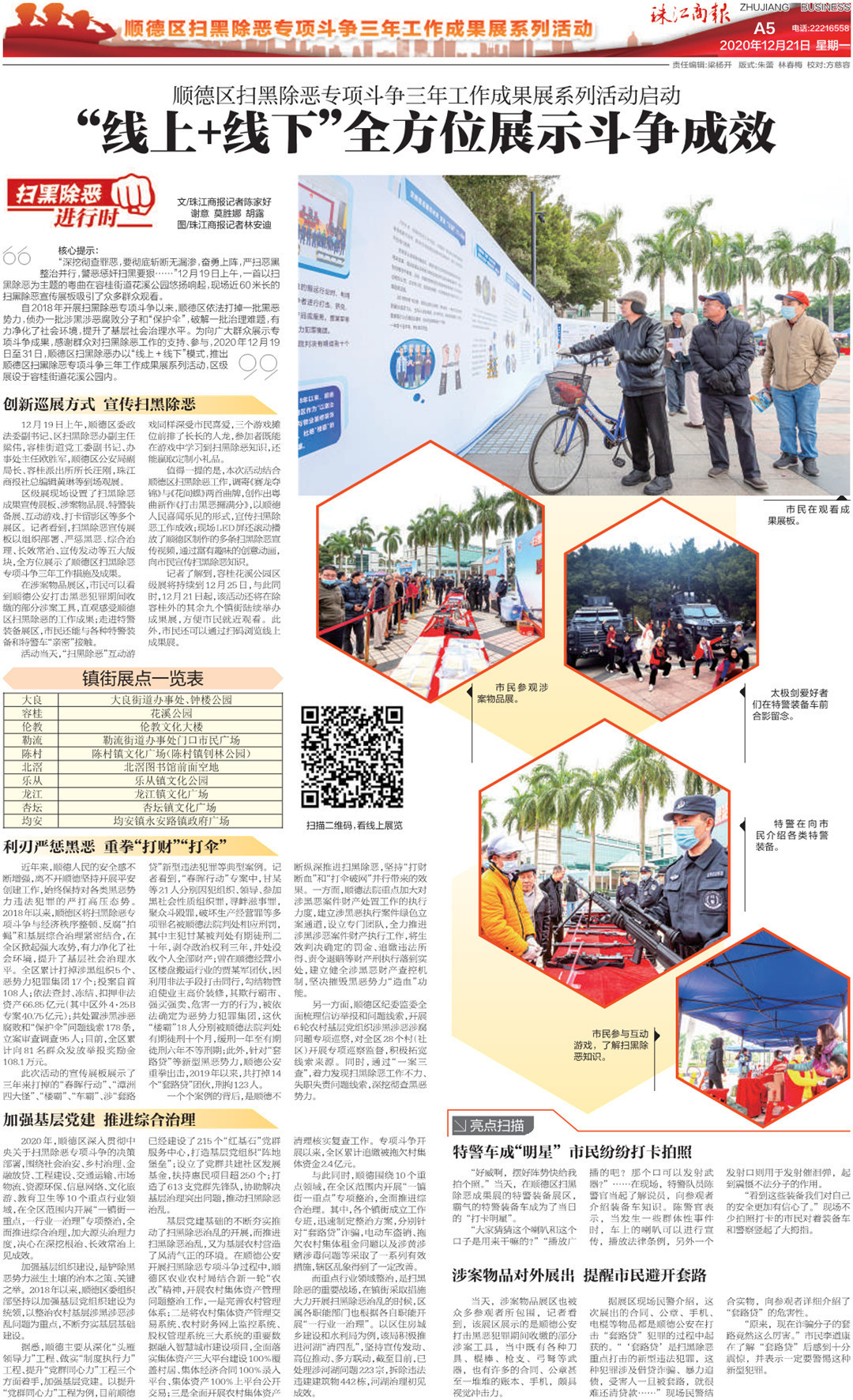 自2018年開(kāi)展掃黑除惡專項(xiàng)斗爭(zhēng)以來(lái),順德區(qū)依法打掉一批黑惡勢(shì)力,偵辦一批涉黑涉惡腐敗分子和“保護(hù)傘”,破解一批治理難題,有力凈化了社會(huì)環(huán)境,提升了基層社會(huì)治理水平。為向廣大群眾展示專項(xiàng)斗爭(zhēng)成果,感謝群眾對(duì)掃黑除惡工作的支持、參與,2020年12月19日至31日,順德區(qū)掃黑除惡辦以“線上+線下”模式,推出順德區(qū)掃黑除惡專項(xiàng)斗爭(zhēng)三年工作成果展系列活動(dòng),區(qū)級(jí)展設(shè)于容桂街道花溪公園內(nèi)。
