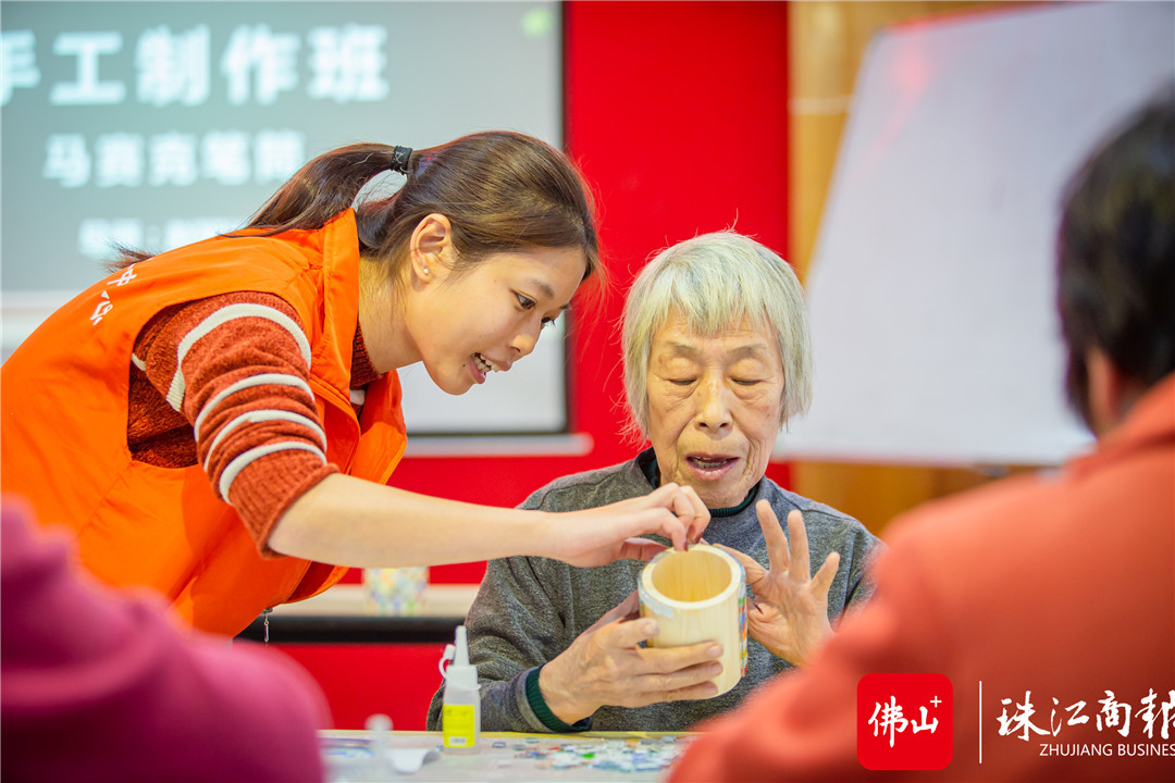 龍眼村老人活動(dòng)中心“德康園”開設(shè)長者手工制作 班,長者與義工一起制作馬賽克筆筒。