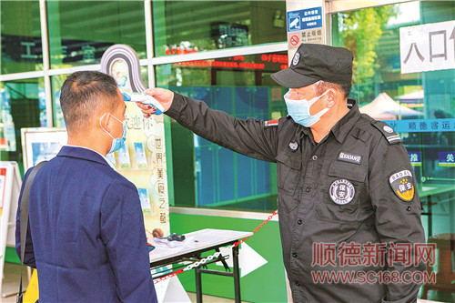 順德汽車客運總站工作人員在售票大廳門口為準備進廳市民測量體溫。/珠江商報記者朱德文攝