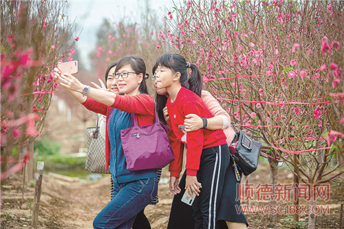 去年1 月11 日舉辦的第二屆勒流連杜桃花會暨桃花鄉(xiāng)宴品鑒活動中,市民正在桃花林中自拍。