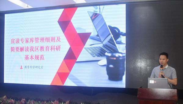 隨后,區(qū)教育發(fā)展中心教科室副主任黃書(shū)剛宣讀了專(zhuān)家?guī)旃芾砑?xì)則及簡(jiǎn)要解讀我區(qū)教育科研基本規(guī)范和流程。