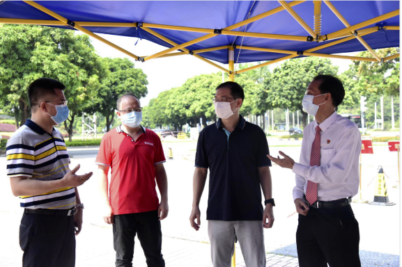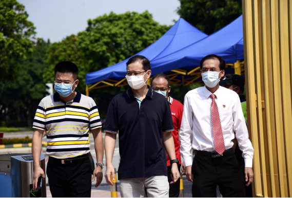 2020年8月29日上午,順德區(qū)教育局黨組書記陳宇瑩偕同區(qū)教育局辦公室副主任羅泉良來到順德華僑中學,對華僑中學校園疫情防控和新學期開學準備工作進行督查檢查。學校黨總支書記、校長吳劍平等行政人員陪同督導檢查。