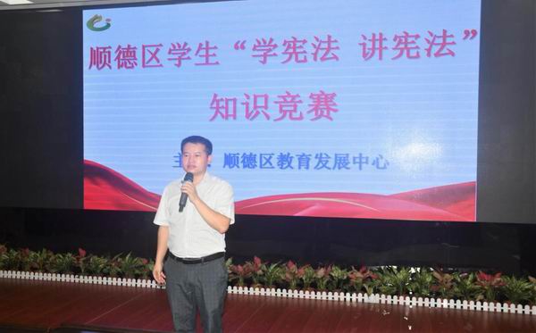 競賽活動上,順德區(qū)教育發(fā)展中心何儀昌副書記做賽前講話,何書記對開展此次競賽活動的背景以及目的、意義進行了解讀,對競賽紀(jì)律、規(guī)則提出了具體的要求,同時也寄語參賽選手要學(xué)習(xí)憲法、遵守憲法、維護憲法、運用憲法,爭做憲法小衛(wèi)士。