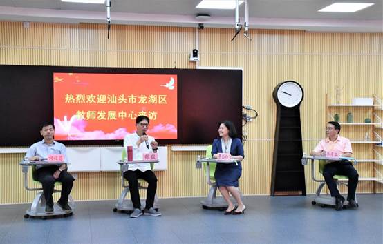 在交流互動環(huán)節(jié),汕頭市龍湖區(qū)研訓(xùn)團(tuán)隊就教研工作的有效開展、質(zhì)量監(jiān)測的系統(tǒng)運作、智慧課堂的實際運用等問題進(jìn)行提問,雙方人員積極互動,交流經(jīng)驗。