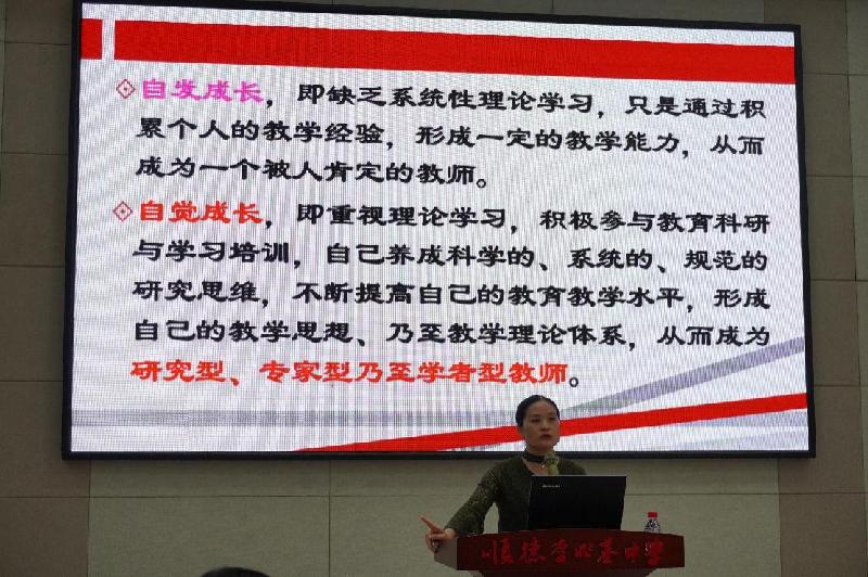 潘校長(zhǎng)以“自發(fā)成長(zhǎng)”和“自覺(jué)成長(zhǎng)”為切入點(diǎn),分享她的專業(yè)成長(zhǎng)和自我的教學(xué)主張。