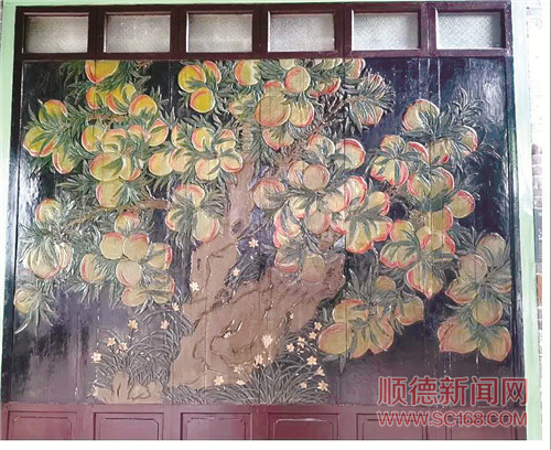 《百壽桃》位于清暉園博物館內(nèi)一座外表平實、低調(diào)的磚木結(jié)構(gòu)單間廳堂“小蓬萊”內(nèi),為大型木浮雕。上刻一棵枝繁葉茂、果實飽滿的仙桃樹,碩大的“仙桃”透出熟透的紅暈,襯出滿堂喜氣。雖說是《百壽桃》,但粗略數(shù)來卻只有99個桃子,這是為什么呢?