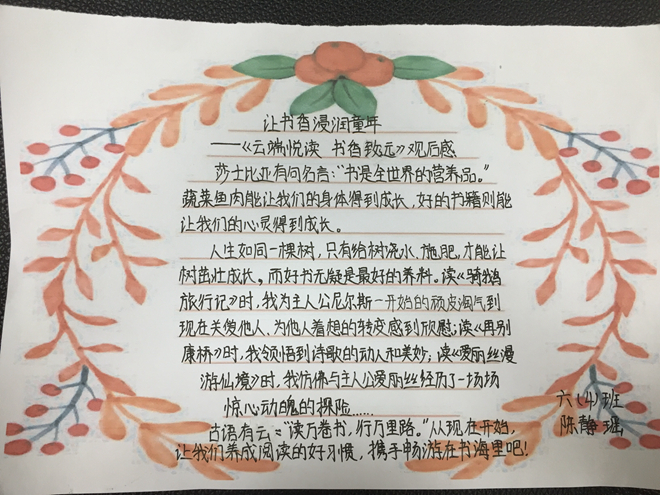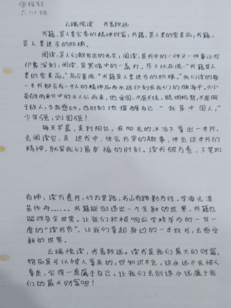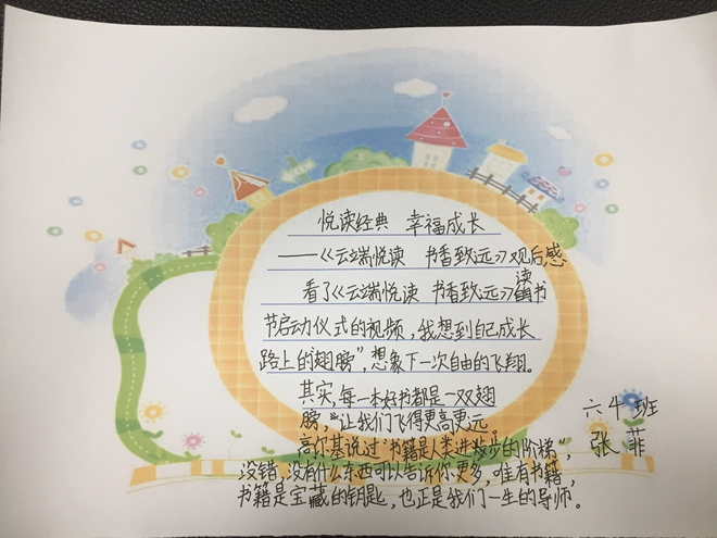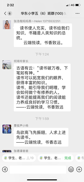 恰逢今天是五、六年級學(xué)生返校,于是本次活動分線下和線上釘釘直播兩部分進(jìn)行。首先,由龍家怡老師向五、六年級全體師生介紹本次活動的意義和介紹讀書節(jié)啟動儀式活動流程。其次,由葉麗燕副校長詳細(xì)解讀本學(xué)期讀書節(jié)活動方案。然后,學(xué)生們觀看讀書節(jié)啟動儀式視頻并撰寫觀后感。一到四年級的讀書節(jié)啟動儀式在釘釘班群上也同時進(jìn)行。班主任通過直播向?qū)W生、家長介紹了本次云端讀書節(jié)活動,對學(xué)生的閱讀方法進(jìn)行指導(dǎo)后,觀看讀書節(jié)啟動儀式視頻。視頻中,龍江鎮(zhèn)教育局教研專干陳金梅、龍江鎮(zhèn)教育局德育專干和專職責(zé)任督學(xué)劉自力、李耀宗校長、各行政干部、骨干教師代表、家長和學(xué)生代表通過引用關(guān)于“讀書”的名人名言,號召全體師生多讀書,讀好書,積極參與到讀書節(jié)的各項活動中去。在看完了讀書節(jié)啟動儀式視頻后,同學(xué)和家長紛紛表示:視頻拍得太好了,讓人深深陶醉在書香中。六(4)班彭誠真同學(xué)在觀后感里面寫到:書籍,可以滋養(yǎng)我們的靈魂。讓我們與書相伴,幸福成長。二(6)班劉雅婷家長說:為華東小學(xué)的讀書節(jié)點贊!讓讀書成為一種時尚,讓學(xué)習(xí)成為一種習(xí)慣。讀萬卷書,行萬里路!