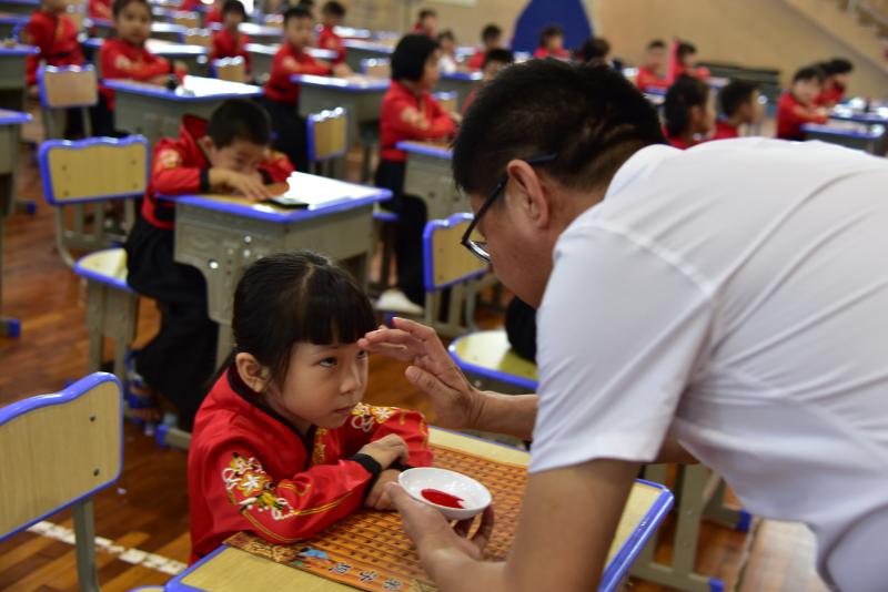 在古代,學童入學讀書前,都會有啟蒙師長用紅色的朱砂在學子們的額頭正中點上紅痣,稱為“開天眼”?!梆搿蓖ā爸恰?,意為開啟智慧,以此寄托美好的愿望,從此眼明心亮,好讀書、讀好書、讀書好。夏校長、學校領(lǐng)導、班主任、科任老師到學生場地為新生點智。