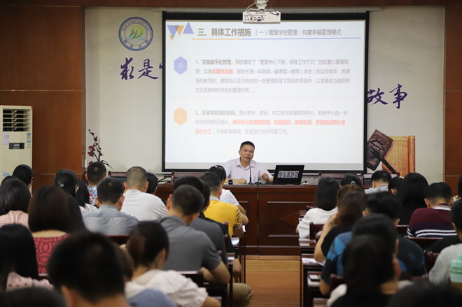 隨后,學校領導班子成員分別就學校教學、德育、特色社團等各項工作做了重要講話。葉麗燕副校長主要從管理、教科研和書香校園建設活動三大方面對新學期教學教研工作進行部署,希望我校教學成績更上一層樓。何慧榮副校長主要從教育理念、德育隊伍建設、學生干部隊伍建設、家校聯系、養(yǎng)成教育和校園文化方面對新學期德育工作進行安排,希望良好的德育能為學生錦上添花。廖檳強書記則從學校特色社團方面展開布置,希望新學期我校特色社團更加燦爛多姿。伍其印主任和嚴冬花主任分別從教師紀律和安全方面做出要求,保障學校在教育教學期間安全有序。