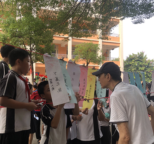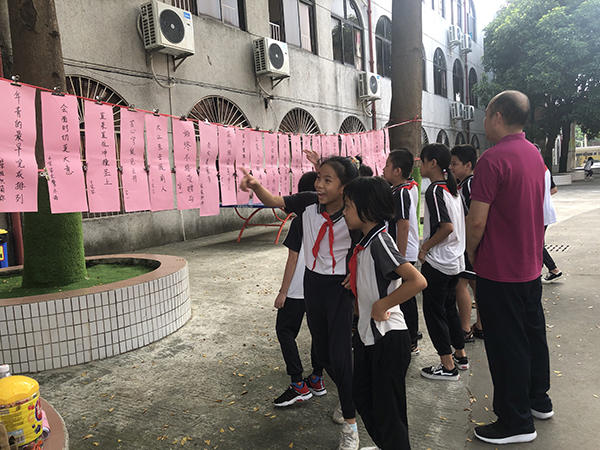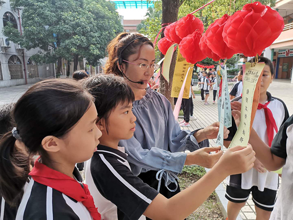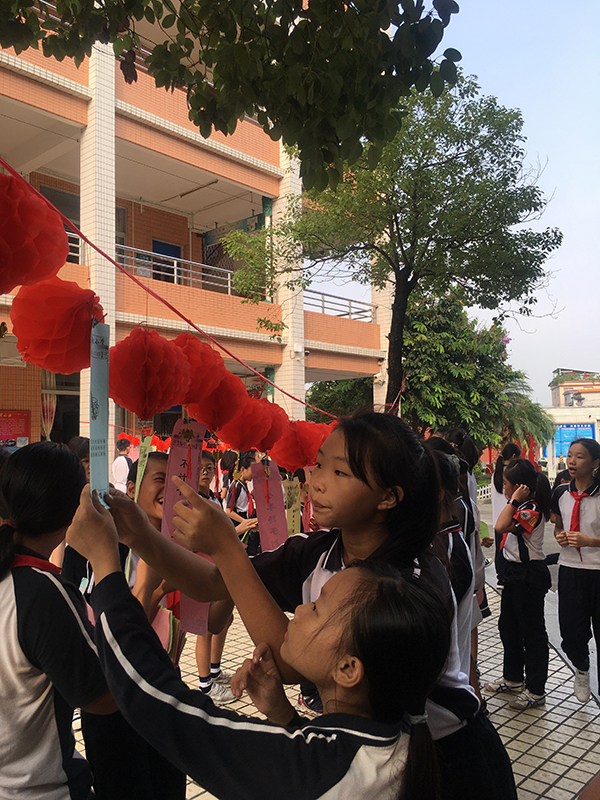 是日,秋高氣爽,紅燈籠系著謎條,在秋風中飛舞。孩子們快樂地穿行在謎條間,或沉思,或討論,或駐足仰望……絡(luò)繹不絕。猜中了,取下謎條,興沖沖地走到兌獎區(qū),換來一顆顆甜甜的糖果。猜不中,也不泄氣,繼續(xù)思考……燈謎協(xié)會到譚沃宏老師和葉汝泉老師也一同前來,跟我們到小謎友互動,他們上那么耐心地講解,孩子們仰著腦袋,認真聆聽著……