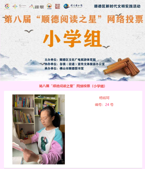三月,我校楊銘珂同學(xué)入圍第八屆“順德區(qū)閱讀之星”評選。楊銘珂同學(xué)從小就開始培養(yǎng)自己的閱讀習(xí)慣,對書籍充滿興趣。楊同學(xué)認(rèn)為閱讀就是充實自己的最好方式,也是提升自我實力、豐富人生的一劑良藥。
