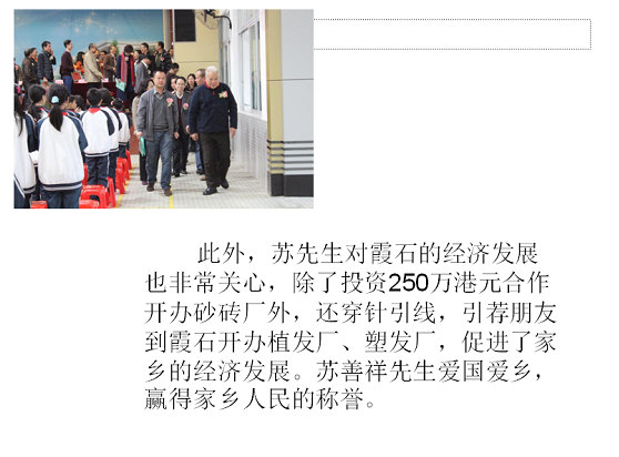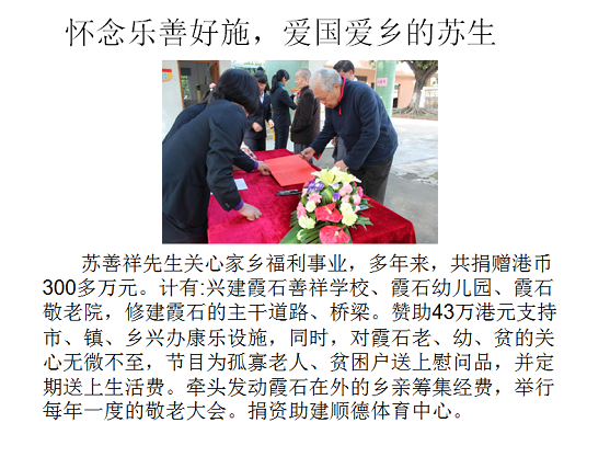 班會課上,同學們了解到善祥先生是一位樂善好施、受人尊敬的企業(yè)家,多年來一直為家鄉(xiāng)建設與教育事業(yè)作出巨大的貢獻。多年來,他共捐贈港幣300多萬元支持家鄉(xiāng)建設。為了促進家鄉(xiāng)的經濟發(fā)展,他不僅投資250萬港元合作開辦砂磚廠,還穿針引線,引薦身旁朋友到霞石投資設廠;為了敬老尊老,他興建敬老院,并每年牽頭發(fā)動霞石在外的鄉(xiāng)親籌集經費,舉行每年一度的敬老大會;為了發(fā)展教育,他投資興建了霞石善祥學校和霞石幼兒園,舉辦獎教獎學大會,獎勵認真讀書的學生和勤奮的老師們,關注霞石學子的成長。這位可愛的老人對家鄉(xiāng)的感情深厚,總是想方設法地為鄉(xiāng)親們做著一件件力所能及的事情,他無私的大愛,贏得了村民對他的敬佩和贊頌。