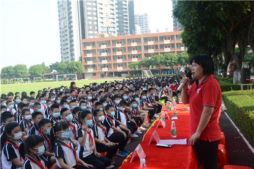 接下來是何柳森校長發(fā)言致辭,何校長對奮揚全體師生寄予新學(xué)期的祝福和期望。何校長提到,本學(xué)年是特殊的一年,我們奮揚學(xué)子搬遷至匯賢實驗學(xué)校要學(xué)會感恩,感謝匯賢實驗學(xué)校提供優(yōu)美的學(xué)習(xí)環(huán)境,感謝搬遷中為奮揚學(xué)子默默付出的老師和義工家長們。最后她引用疫情中逆風(fēng)前行的醫(yī)護(hù)人員們的故事,告訴我們:新學(xué)期,我們奮揚人,也要逆風(fēng)前行,向陽而生!
