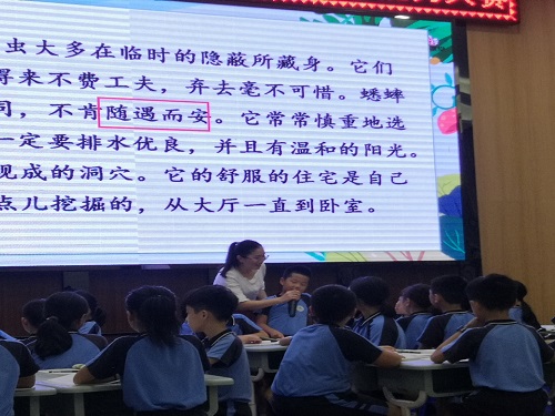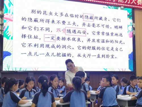 下午的第二場(chǎng)課堂展示環(huán)節(jié),張小語(yǔ)老師給在場(chǎng)評(píng)委和老師們帶來(lái)了有趣生動(dòng)的《蟋蟀的住宅》一課。張老師先從其他動(dòng)物的家入手,引出蟋蟀的住宅;緊接著帶領(lǐng)學(xué)生從具體語(yǔ)句領(lǐng)略蟋蟀住宅的外部特點(diǎn)、內(nèi)部設(shè)置等特點(diǎn),感受蟋蟀住宅是一項(xiàng)偉大的工程。最難能可貴的是,張老師引導(dǎo)學(xué)生品析句子,并能針對(duì)性的給予指導(dǎo),反復(fù)朗讀,細(xì)細(xì)品味,讓學(xué)生在關(guān)鍵詞的誦讀中體會(huì)蟋蟀住宅的偉大。在老師的啟發(fā)引導(dǎo)下,學(xué)生主動(dòng)探究,大膽質(zhì)疑,積極思考。