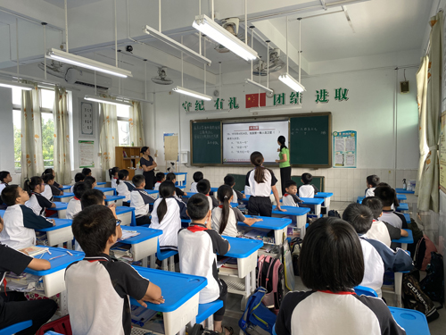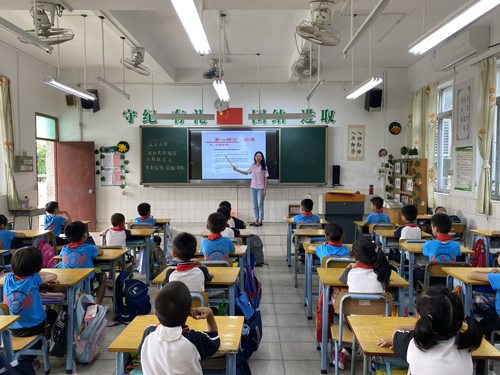 圖為老師講授國(guó)旗、國(guó)徽、國(guó)歌的由來(lái)和象征意義