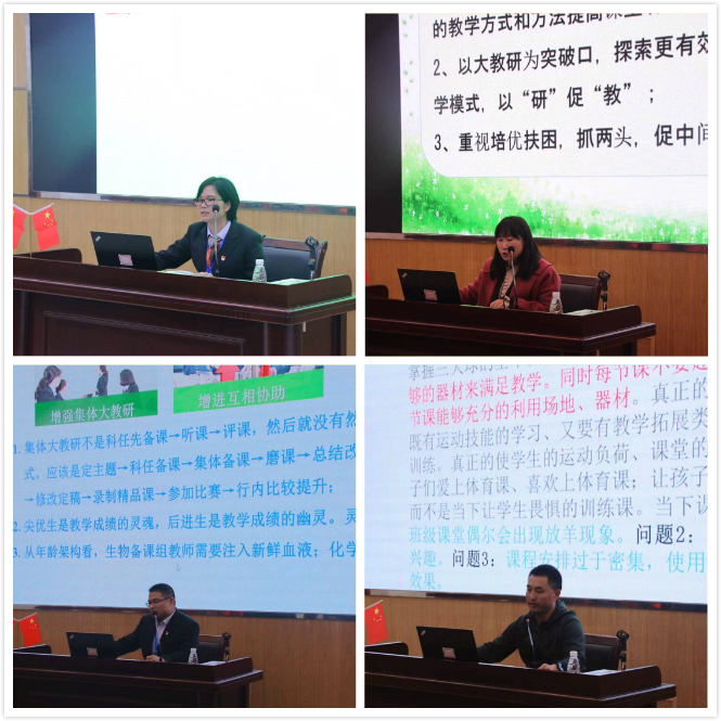 隨后,各科組長逐一上臺匯報,針對本學(xué)期科組的教研工作進(jìn)行了全面的梳理。同時圍繞一學(xué)期來科組開展的教學(xué)常規(guī)、教學(xué)研究、科組活動、競賽輔導(dǎo)等各項工作存在的不足以及解決措施進(jìn)行了深入淺出的總結(jié)說明。各科組的總結(jié)說明,理清了工作思路,明確了今后工作的重點(diǎn),為學(xué)校下學(xué)期教育教學(xué)及科組工作的開展、教學(xué)質(zhì)量的提升奠定了堅實的基礎(chǔ)。