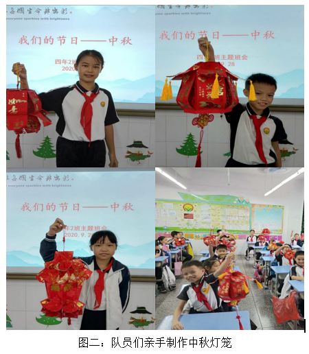 首先各班認(rèn)真進(jìn)行中秋節(jié)和國慶節(jié)的主題班會(huì)。輔導(dǎo)員們聲情并茂地介紹中秋節(jié)的起源、風(fēng)俗、相關(guān)的故事,從而有效加深了學(xué)生對(duì)我國傳統(tǒng)節(jié)日的理解和認(rèn)識(shí),激發(fā)文化自信。隊(duì)員們更通過制作中秋燈籠,進(jìn)一步感受濃濃的中秋氛圍。再而通過學(xué)習(xí)國慶節(jié)的演變歷史、來歷、意義和活動(dòng),更結(jié)合抗擊疫情,感受祖國的巨大進(jìn)步與繁榮昌盛,進(jìn)一步激發(fā)了學(xué)生強(qiáng)烈的愛國熱情與民族自豪感。