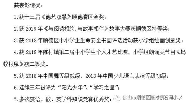 仇賢斌同學(xué)學(xué)習(xí)興趣廣泛,樂于助人,關(guān)心集體,是老師的得力助手。他撰寫的征文在廣東省“我和我的祖國”主題教育活動中獲得三等獎;曾獲順德區(qū)“我的校園我的家”微征文比賽人氣獎;陳村鎮(zhèn)科技創(chuàng)新大賽科幻繪畫比賽獲一等獎;石洲村小學(xué)生繪畫比賽三等獎;連續(xù)4年被學(xué)校評為“陽光少年”、“陽光班干部”。