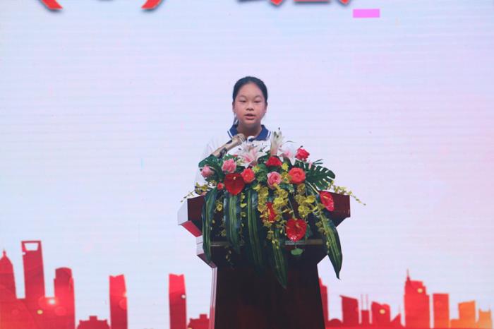 隨后,七年級一班盧一鼎同學以《揚帆起航,用經(jīng)典澆灌夢想之花》為主題作代表發(fā)言。她以自身閱讀的經(jīng)歷,向大家分享了從《丑小鴨》、《假如給我三天光明》、《西游記》等故事中領悟到的人生哲理。并呼吁大家手捧書本,與書為友,愛上閱讀,用經(jīng)典澆灌我們的夢想之花,遇見更好的自己。