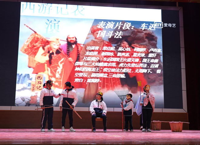 這次活動(dòng),各班的代表同學(xué)集合大家的智慧,寫(xiě)劇本、制作道具、配音,以小劇場(chǎng)的形式在舞臺(tái)上為全年級(jí)師生表演了《西游記》中的經(jīng)典故事,如158班的《豬八戒撞天婚》、159班的《二調(diào)芭蕉扇》、160班的《車遲國(guó)斗法》、161班的《三打白骨精》等,小演員們的表演十分精彩有趣,動(dòng)作表情滑稽又不失活力?;顒?dòng)的現(xiàn)場(chǎng)精彩紛呈,贏得了師生們一陣又一陣熱烈的掌聲。極大地激發(fā)同學(xué)們閱讀名著的興趣。