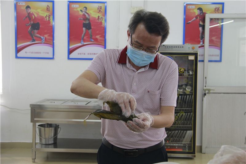 隨后,空課的老師們陸續(xù)到達(dá)學(xué)校飯?zhí)瞄_始包粽子。有經(jīng)驗(yàn)的老師將糯米、豬肉等材料在粽葉中填滿扎牢;沒有包粽子經(jīng)驗(yàn)的老師,在同事的幫助下,現(xiàn)場邊看邊學(xué),踐行操作,直至熟練掌握包粽技巧。