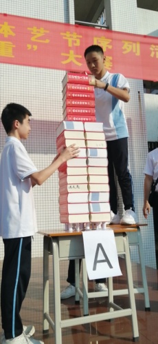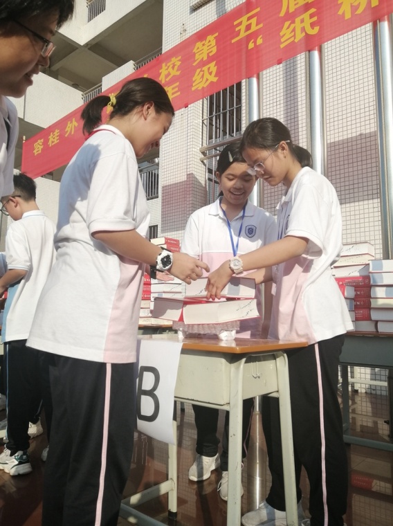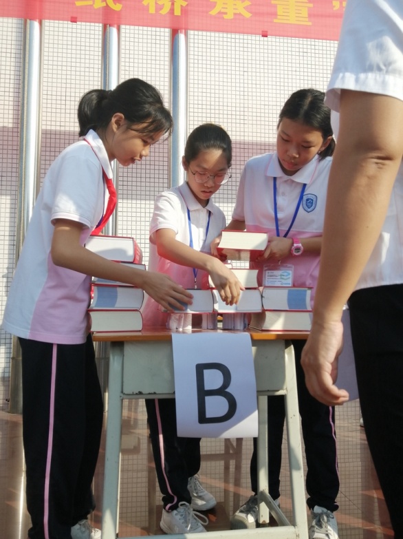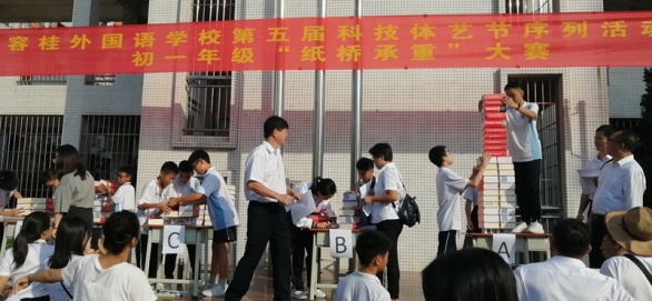 原來現(xiàn)場正在舉行容桂外國語學(xué)校第五屆科技節(jié)系列活動(dòng)之初一年級“紙橋承重”大賽。