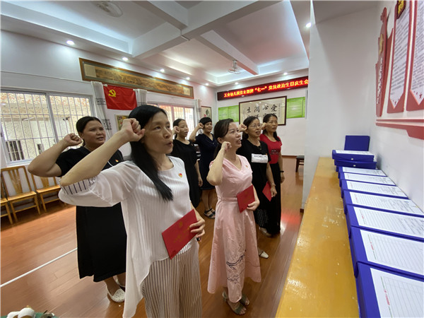 7月1日由黨支部書記柯英麗向在座的黨員們送去節(jié)日的祝福和問候,并介紹了此次活動開展的目的和意義。幾位黨員圍繞“如何發(fā)揮先鋒作用”談談自身感悟,找找自身存在的問題和原因,在思想上經(jīng)受一次“洗禮”。隨后,慶祝黨員何秀華、姚麗嫦、吳裕蘭、柯英麗四位同志“政治生日”,在莊嚴的氣氛中黨支部書記帶領黨員舉起右手,面對黨旗,重溫入黨誓詞。
