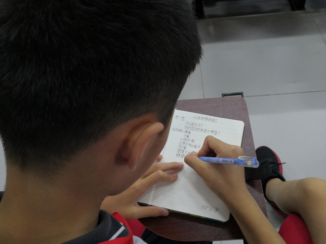 活動中,譚醫(yī)生從“壓力與身心健康”和“如何從壓力中營救自己”兩方面給孩子們上了一節(jié)輕松愉快的心理健康課。孩子們積極參與并發(fā)表了自己的見解,也將譚醫(yī)生給出的建議認(rèn)真做好筆記。