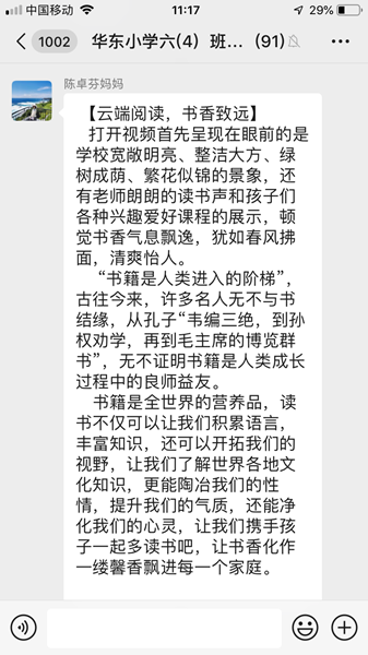 恰逢今天是五、六年級學(xué)生返校,于是本次活動(dòng)分線下和線上釘釘直播兩部分進(jìn)行。首先,由龍家怡老師向五、六年級全體師生介紹本次活動(dòng)的意義和介紹讀書節(jié)啟動(dòng)儀式活動(dòng)流程。其次,由葉麗燕副校長詳細(xì)解讀本學(xué)期讀書節(jié)活動(dòng)方案。然后,學(xué)生們觀看讀書節(jié)啟動(dòng)儀式視頻并撰寫觀后感。一到四年級的讀書節(jié)啟動(dòng)儀式在釘釘班群上也同時(shí)進(jìn)行。班主任通過直播向?qū)W生、家長介紹了本次云端讀書節(jié)活動(dòng),對學(xué)生的閱讀方法進(jìn)行指導(dǎo)后,觀看讀書節(jié)啟動(dòng)儀式視頻。視頻中,龍江鎮(zhèn)教育局教研專干陳金梅、龍江鎮(zhèn)教育局德育專干和專職責(zé)任督學(xué)劉自力、李耀宗校長、各行政干部、骨干教師代表、家長和學(xué)生代表通過引用關(guān)于“讀書”的名人名言,號召全體師生多讀書,讀好書,積極參與到讀書節(jié)的各項(xiàng)活動(dòng)中去。在看完了讀書節(jié)啟動(dòng)儀式視頻后,同學(xué)和家長紛紛表示:視頻拍得太好了,讓人深深陶醉在書香中。六(4)班彭誠真同學(xué)在觀后感里面寫到:書籍,可以滋養(yǎng)我們的靈魂。讓我們與書相伴,幸福成長。二(6)班劉雅婷家長說:為華東小學(xué)的讀書節(jié)點(diǎn)贊!讓讀書成為一種時(shí)尚,讓學(xué)習(xí)成為一種習(xí)慣。讀萬卷書,行萬里路!