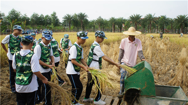 活動包括收割稻谷、扎稻草人、心肺復蘇安全教育、田園野炊生存活動、集體游戲等多個精彩環(huán)節(jié)。最令人難忘的,無疑是本次研學課程的“重頭戲”――收割稻谷。在導師講解了收割稻谷的注意事項、展示收割的技巧后,同學們都躍躍欲試。挽起褲腿,拿起鐮刀,彎下身子,割下一株株金黃的稻子,然后到脫粒機前進行脫?!粗馉N燦的稻谷在谷倉里跳動,同學們顯得格外興奮,體驗到了豐收的喜悅,忘了汗水和泥土帶來的酸痛。中午時分,同學們又開始了田園野炊活動,只見同學們分工合作,洗菜、切菜、炒菜、做飯……忙得不亦樂乎,最終吃上了自己做的午餐,這一餐不僅特別美味,還深切體會到了父母常年做飯的艱辛,懂得了增強生活自理能力的重要性。