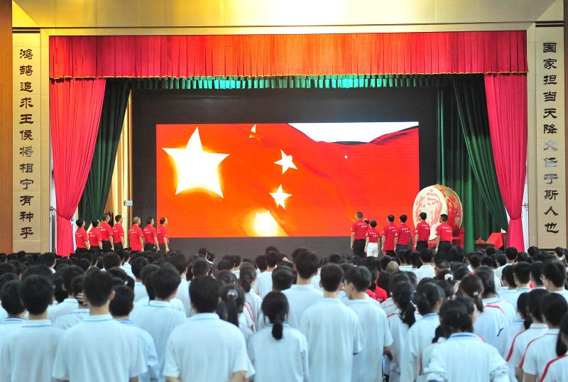 全體師生面向國(guó)旗,齊唱國(guó)歌。為高三的戰(zhàn)士們出征專門升旗,意在告訴同學(xué)們:你們不單是為自己而戰(zhàn),更是為國(guó)而戰(zhàn)!你們要為國(guó)成才,做國(guó)家的棟梁! 國(guó)旗飄飄,勝利照耀! 均中學(xué)子,決勝高考!