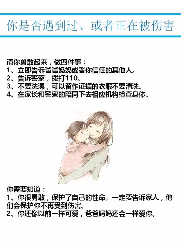 孩子需要有辨別壞人的能力,更需要有對(duì)壞人說“不”的勇氣。保護(hù)兒童任重道遠(yuǎn),這不僅是社會(huì)的責(zé)任、法律的義務(wù)、學(xué)校的職責(zé),也是每一個(gè)爸爸媽媽必須傾盡心力做到的事情。所以我們應(yīng)該告訴孩子,無論他面對(duì)什么困難和問題,只要不是主動(dòng)傷害別人,爸爸媽媽會(huì)永遠(yuǎn)相信她、保護(hù)她,孩子也應(yīng)該要勇敢對(duì)壞人說“不”,不受壞人的威脅,有什么一定要和爸爸媽媽講,相信爸爸媽媽會(huì)永遠(yuǎn)保護(hù)她!