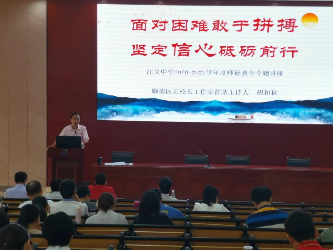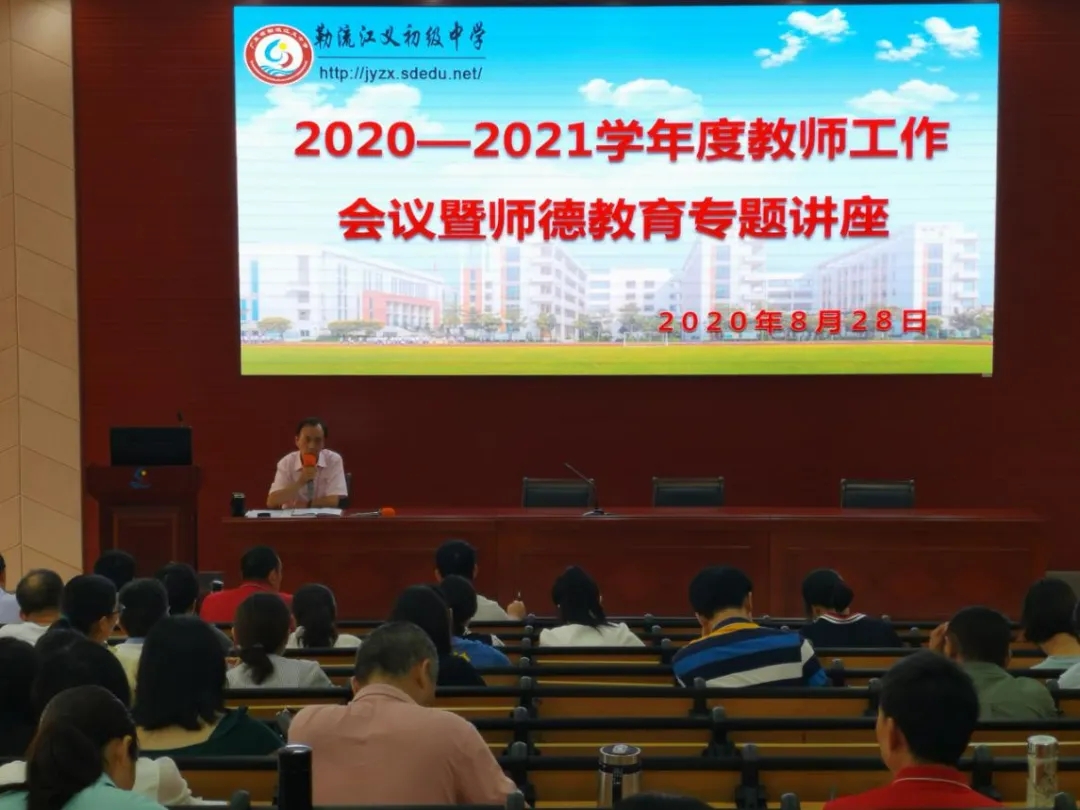 2020年8月28日,江義中學(xué)2020―2021學(xué)年度教師工作會(huì)議暨師德教育專(zhuān)題講座在學(xué)校曉理廳召開(kāi)。學(xué)校黨總支書(shū)記、校長(zhǎng)胡和秋以“面對(duì)困難敢于拼搏,堅(jiān)定信心砥礪前行”為主題,對(duì)學(xué)校新學(xué)期工作進(jìn)行部署和開(kāi)展師德教育專(zhuān)題講座。