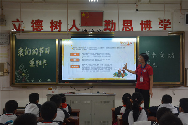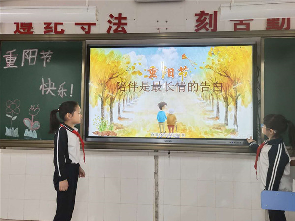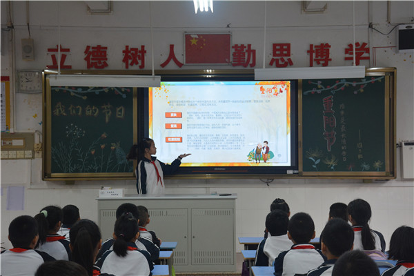10月19日上午,各班還開展了“我們的節(jié)日?重陽”主題班會,向隊員們介紹中華傳統(tǒng)節(jié)日――重陽節(jié)的來歷、習俗等,并開展了主題為“情暖金秋,愛在重陽”的重陽誦讀活動。主題班會上,學生們不僅交流了對重陽節(jié)的了解,知道了重陽節(jié)的由來,別名和各地的風俗,還誦讀了一些有關重陽節(jié)的詩句,讓中華優(yōu)秀傳統(tǒng)文化教育在校園里持續(xù)有效地進行。