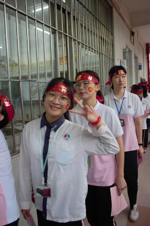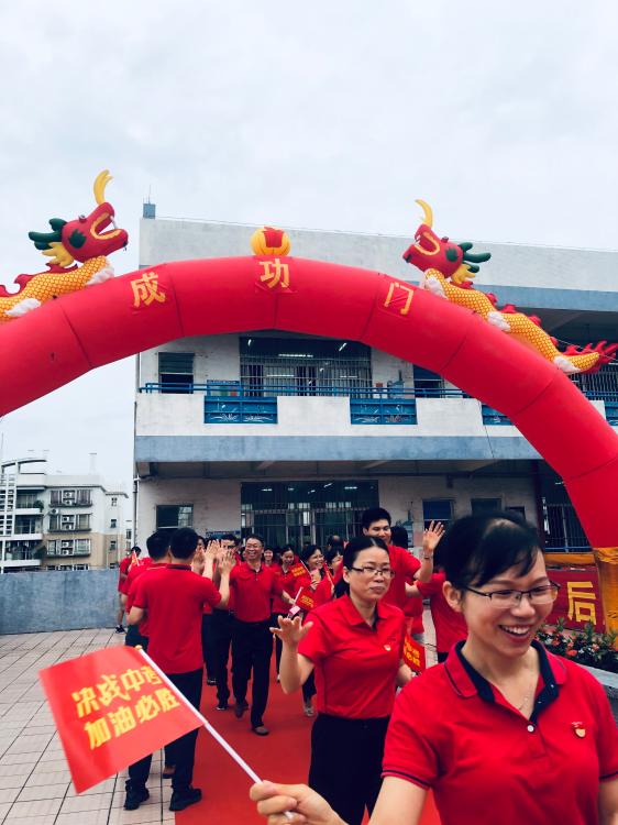 瞬時,同學(xué)們那渴望而又激動的眼神聚焦于“成功門”,仿佛那就是心之所盼的未來!各班的領(lǐng)隊同學(xué)都默默地緊握班旗的旗桿,在班主任的帶領(lǐng)下,同學(xué)們整理好額上的紅絲帶,邊氣勢如虹地高喊口號邊有序地走過“成功門”?!俺晒﹂T”兩側(cè)早有初三級的科任老師列隊靜候著,他們?yōu)槌跞龑W(xué)子搖旗吶喊,擊掌壯行,為這莊嚴的場面增添了一份溫情!
