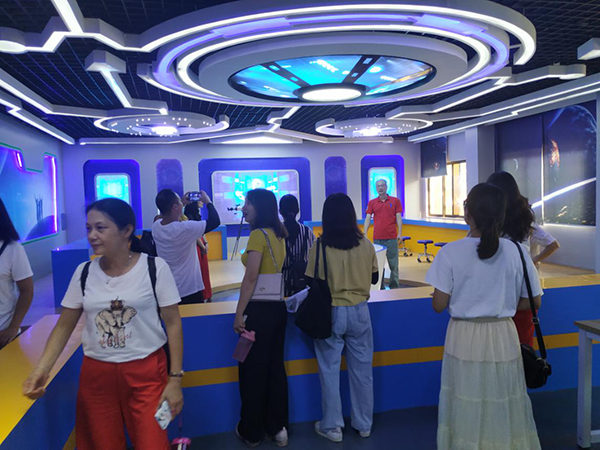 其次,一行人參觀了我校“創(chuàng)客城”,創(chuàng)客城科幻的設(shè)計,吸引了他們的目光,在參觀過程中,譚優(yōu)生校長結(jié)合學(xué)校實際,全面、細(xì)致地介紹了我?!皠?chuàng)客城”建設(shè)與開展活動的情況。來訪的教師對我?!案叽笊稀钡摹皠?chuàng)客城”所體現(xiàn)出來的“科創(chuàng)”文化元素給予了高度贊譽。