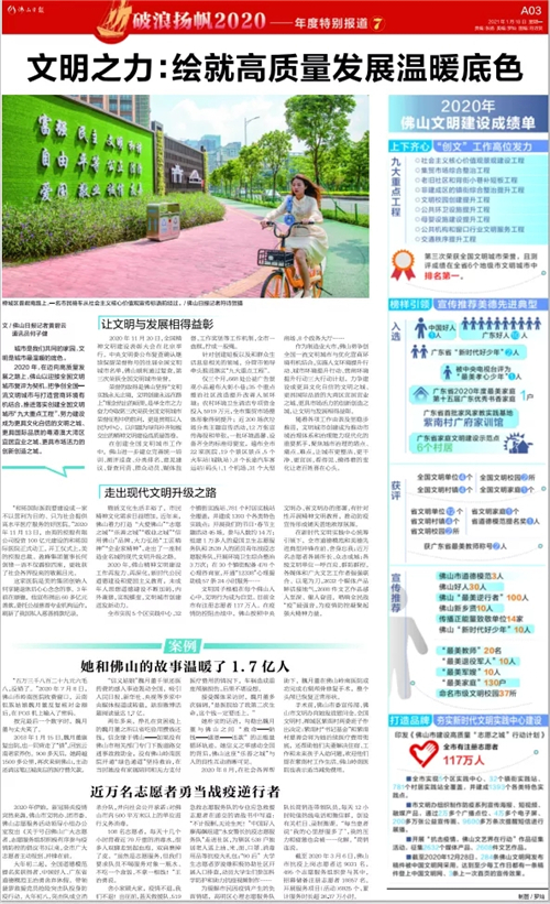 2020年,在邁向高質(zhì)量發(fā)展之路上,佛山以迎接全國文明城市復(fù)評為契機,把爭創(chuàng)全國一流文明城市與打造營商環(huán)境有機結(jié)合,推進落實創(chuàng)建全國文明城市“九大重點工程”,努力建設(shè)成為更具文化自信的文明之城、更具國際品質(zhì)的粵港澳大灣區(qū)宜居宜業(yè)之城、更具市場活力的創(chuàng)新創(chuàng)造之城。